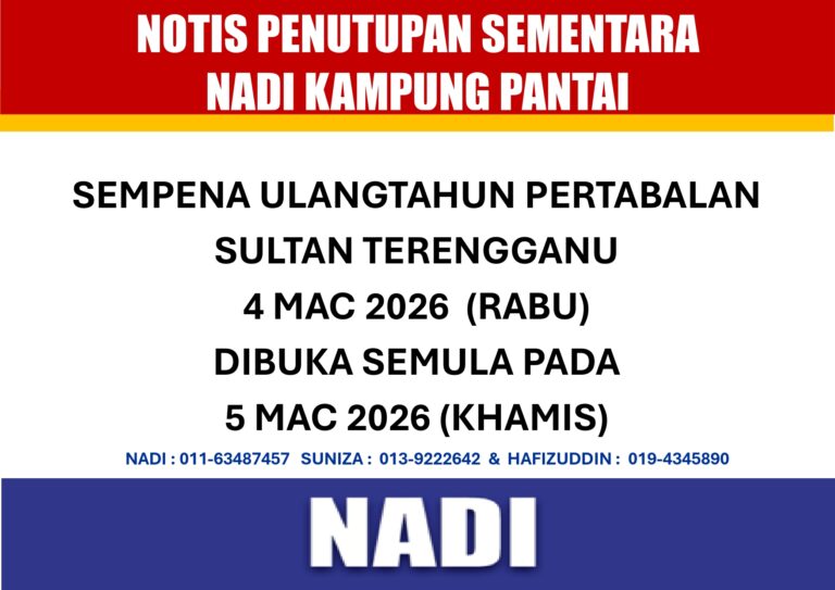 Assalamualaikum Untuk makluman dan perhatian, pihak kami tidak beroperasi pada 04 Mac 2026 sempena Hari Ulangtahun Pertabalan Sultan Terengganu. Sebarang urusan boleh dilakukan sebelum atau selepas tarikh tersebut. Terima kasih