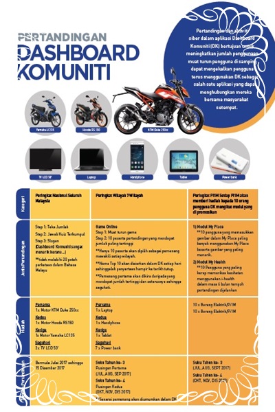 Pertandingan Dashboard Komuniti (DK) akan bermula pada bulan Julai 2017 dan berakhir pada 15 Disember 2017.
