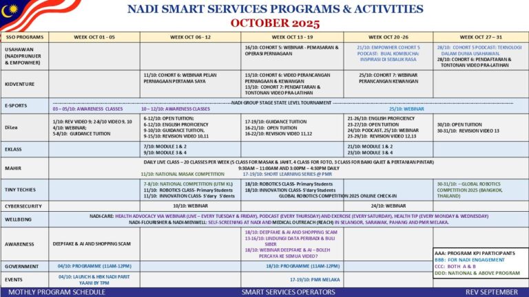 PROGRAM & AKTIVITI OKTOBER 2025! Pelbagai program hebat menanti anda sepanjang bulan OKTOBER 2025 Program Utama Bulan Oktober: TinyTechies National competition is scheduled on October 7-8 @ Residensi UTM KL, followed by Global Competition Oct 29 @ Bangkok. NADI Parit […]