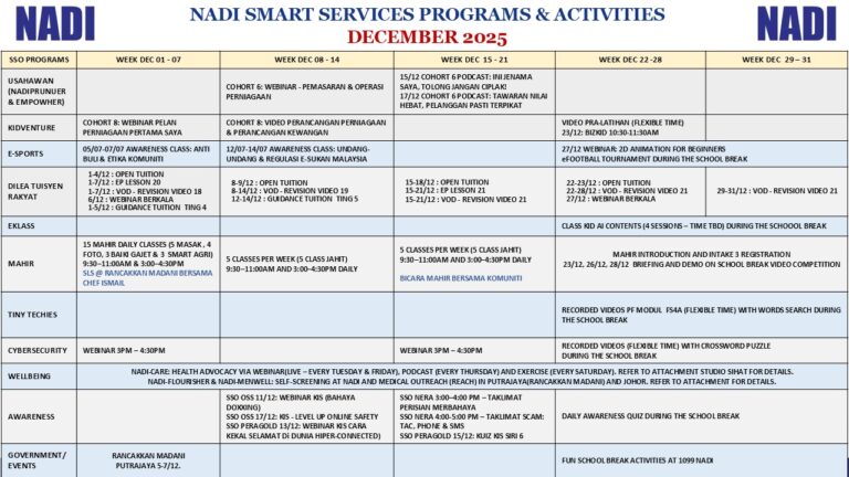 BIL TARIKH PROGRAM TEMPAT 1 03/06/2025 WEBINAR E-USAHAWAN NADI KAMPUNG PANTAI 2 03/06/2025 WELLBEING NADI KAMPUNG PANTAI 3 04/06/2025 KEMPEN INTERNET SELAMAT ( 7- 12 TAHUN ) NADI KAMPUNG PANTAI 4 04/06/2025 KEMPEN INTERNET SELAMAT ( 13 TAHUN KEATAS ) […]
