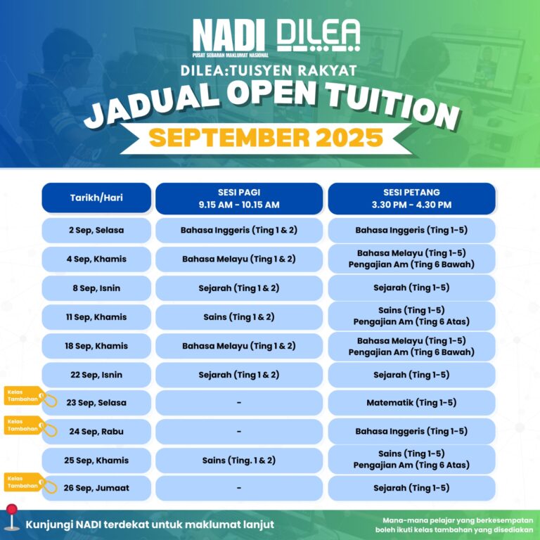 TARIKH 23/24 SEPTEMBER 2025 MASA 03.30-04.30 TEMPAT NADI KAMPUNG PESERTA 1 ORANG TUJUAN Tujuan kelas ini adalah untuk membantu pelajar meningkatkan penguasaan dalam subjek teras seperti Bahasa Melayu, Bahasa Inggeris, Matematik, Sains dan Sejarah menjelang peperiksaan SPM. Selain itu, ia […]