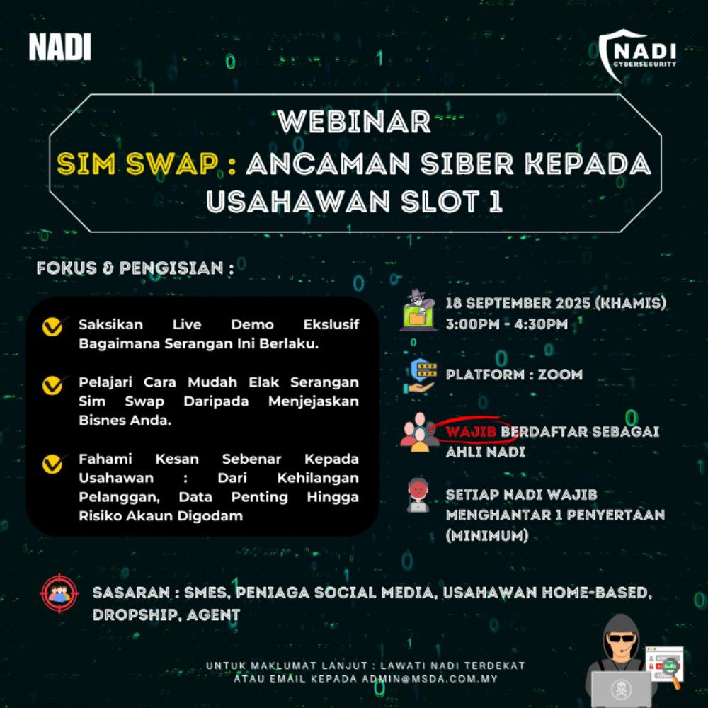 TARIKH 18/09/2025 MASA 03.00-04.30 PETANG TEMPAT NADI KAMPUNG PANTAI PESERTA 1 TUJUAN Tujuan program ini adalah untuk memberi pendedahan kepada para usahawan mengenai risiko keselamatan siber, khususnya ancaman SIM Swap yang boleh menggugat keselamatan perniagaan digital. Dengan perkembangan transaksi atas […]